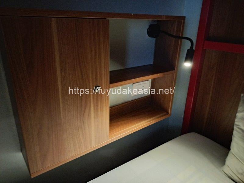 コンセントとベッド用の照明は基本的にどのホステルにもありますが、棚があるところは少ないです。