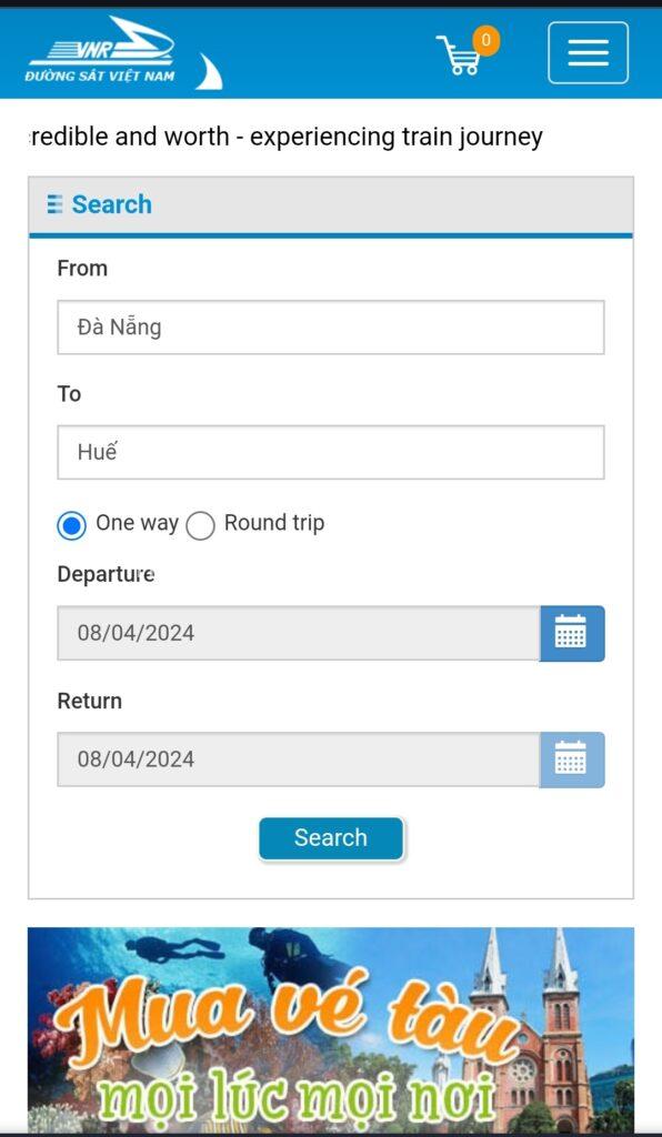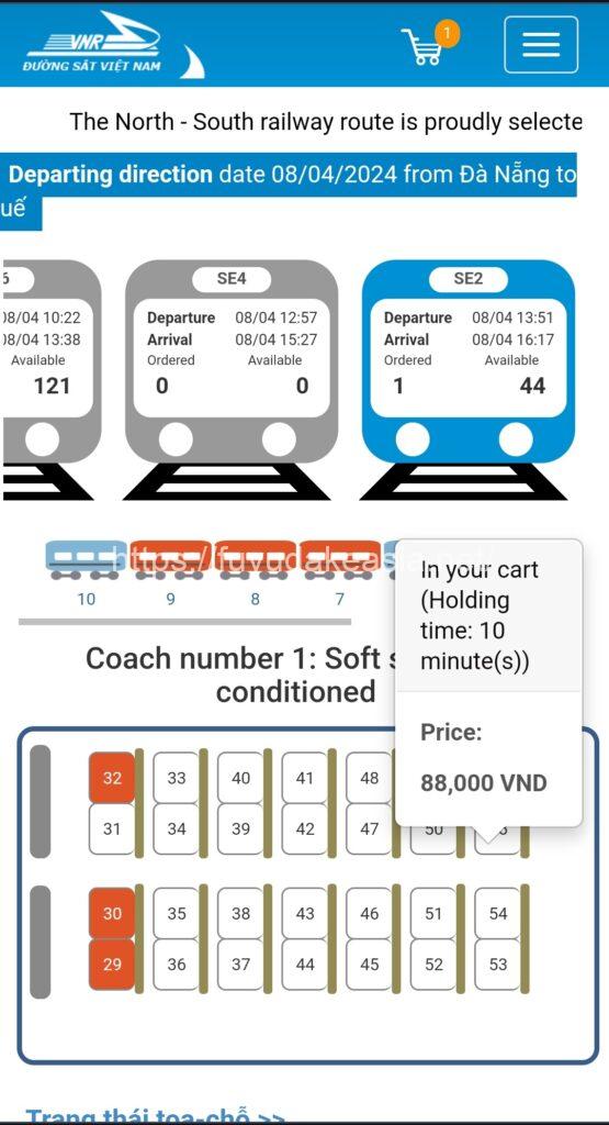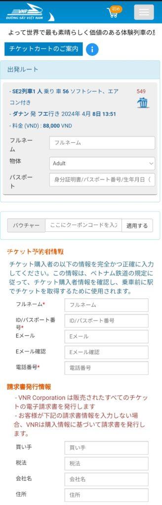ベトナム統一鉄道の公式サイトで、『ダナン(Da Nang)→フエ(Hue)』のチケットを予約しました。