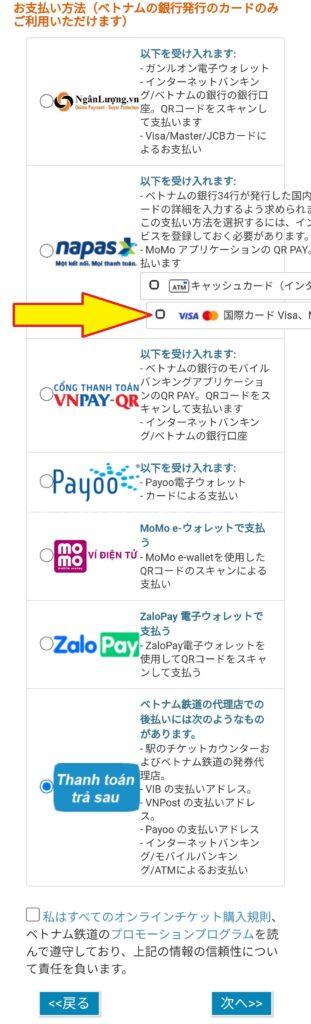 支払い方法はたくさんありますが、なじみのあるものはありません。napasのところにVISAと書かれていたので、ここにチェックを入れて先に進んだら決済画面になりました。