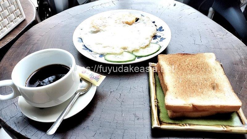 目玉焼き2個とキュウリ、トースト2枚、コーヒー(ブラックorミルク)でした。調味料もあるし、トーストがサクッと香ばしいのでペロリと美味しく食べられました。