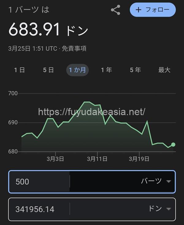 両替可能なのは、500バーツ紙幣以上で100バーツ以下の紙幣と硬貨は断られました。レートはGoogleで調べたもの(1B=683.91VND)よりも良く、1B=712VNDでした。