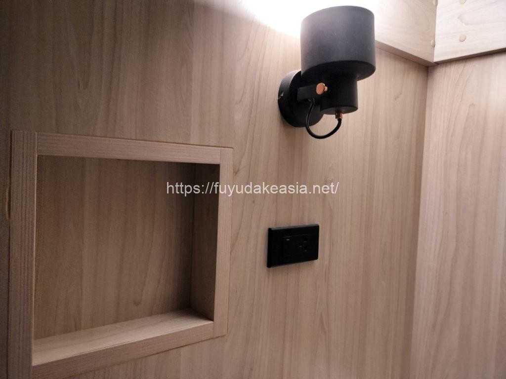 ベッド内にはライトとコンセント1口、ちょっとした小物が置ける凹みがあります。